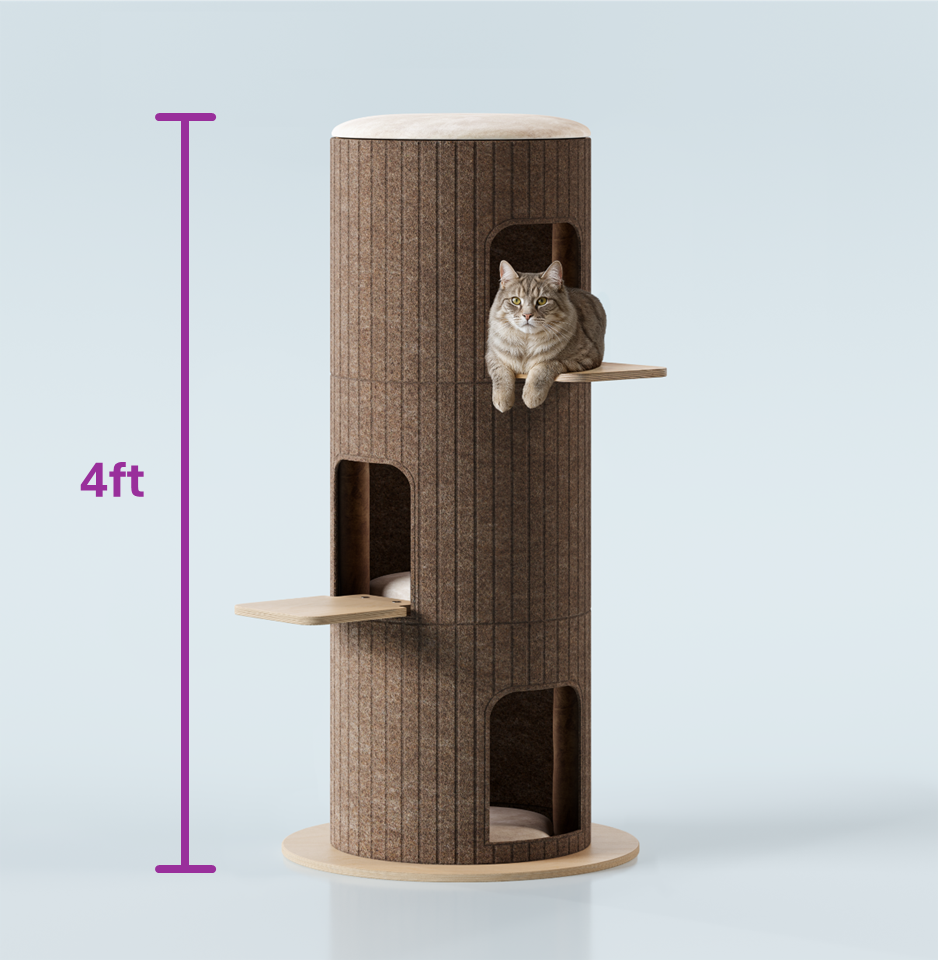 A 4ft modern, year-round cat tower with multiple levels, cozy cushions, and hidden passages for exploration.